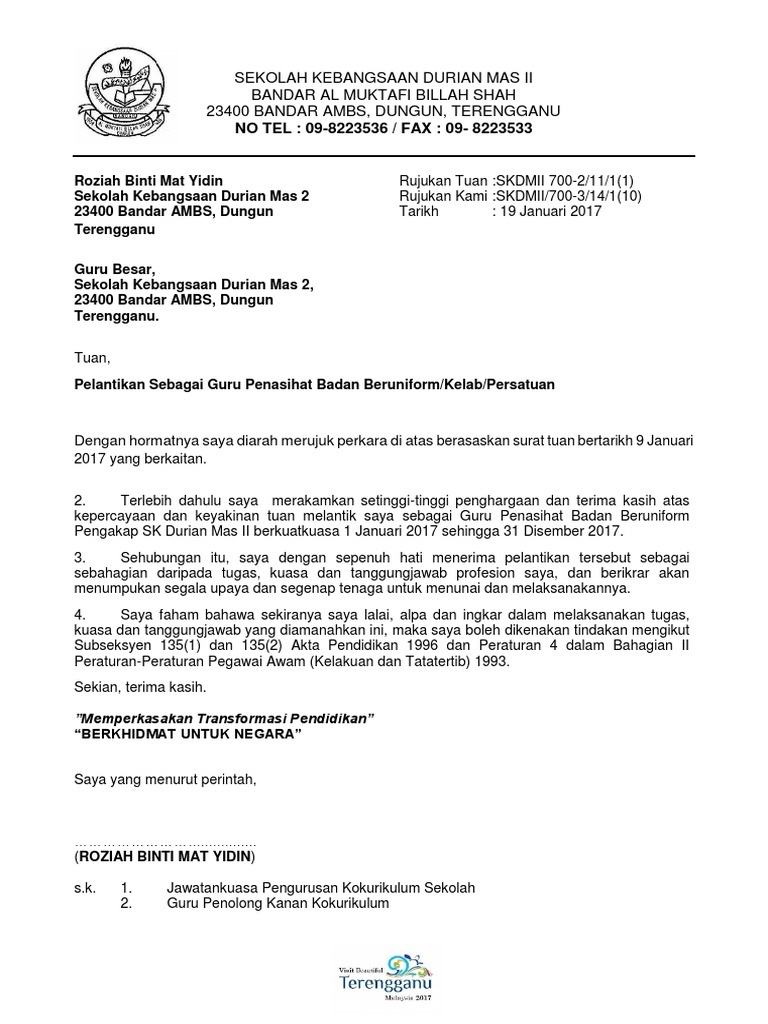 Admin February 15 2016. Surat Penerimaan Lantikan Daripada Guru PenasihatPemimpin. Pemindahan ia adalah satu syarat penerimaan pelantikan ini bahawa tuanpuancikpuan boleh dipindahkan dari satu jawatan kepada yang lain atau dari satu.